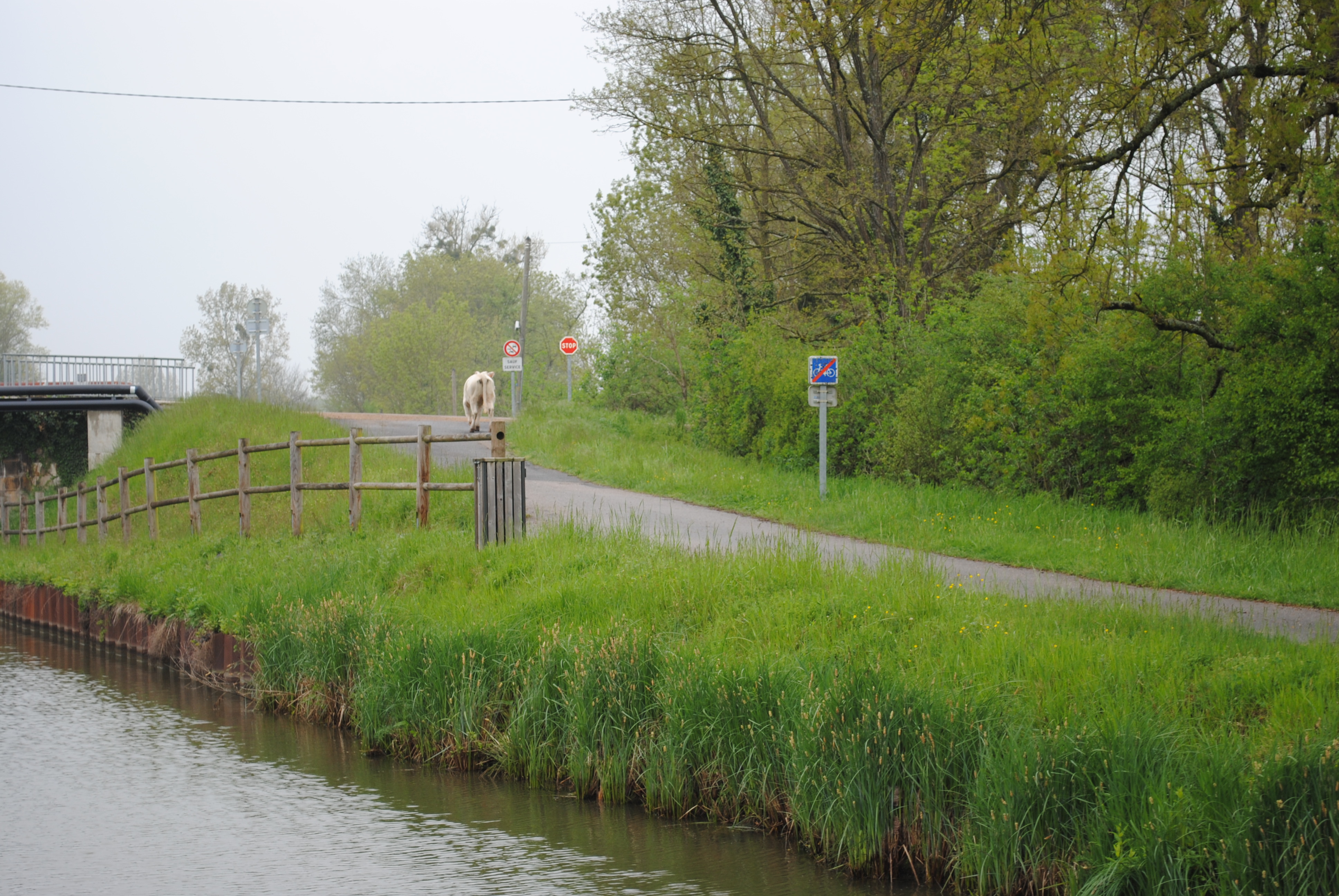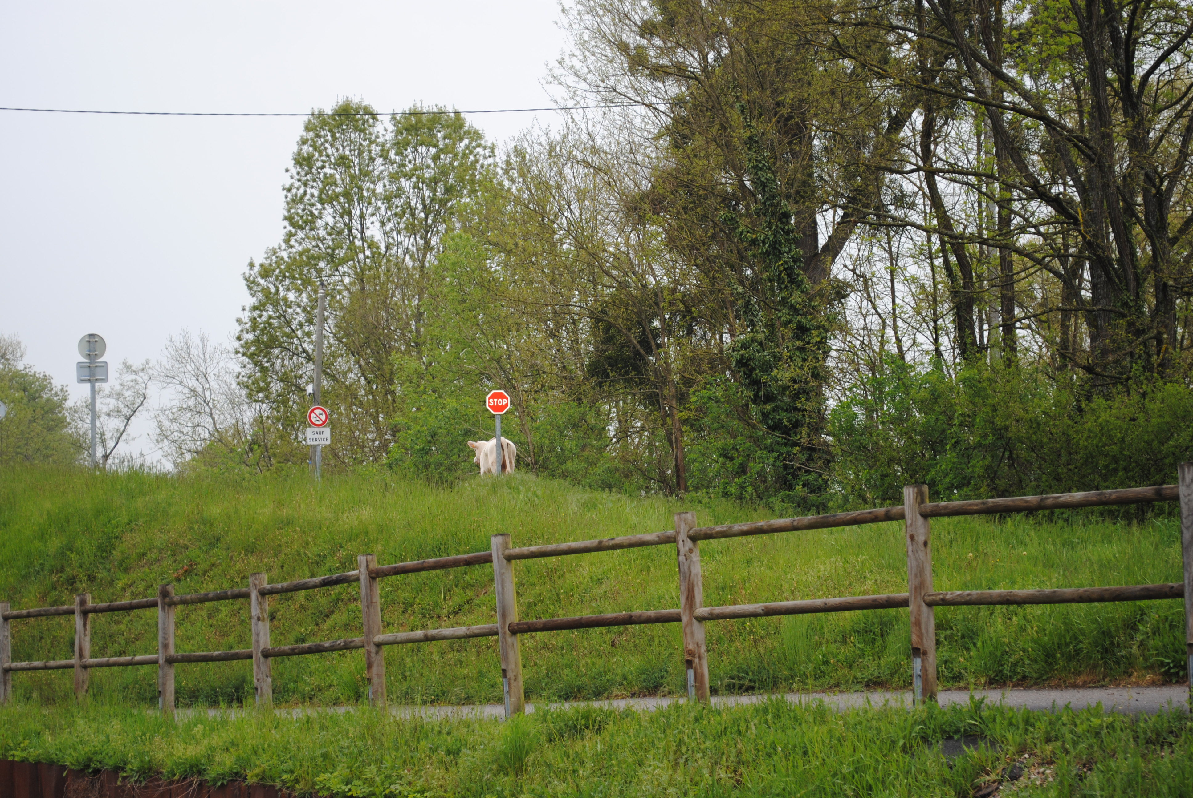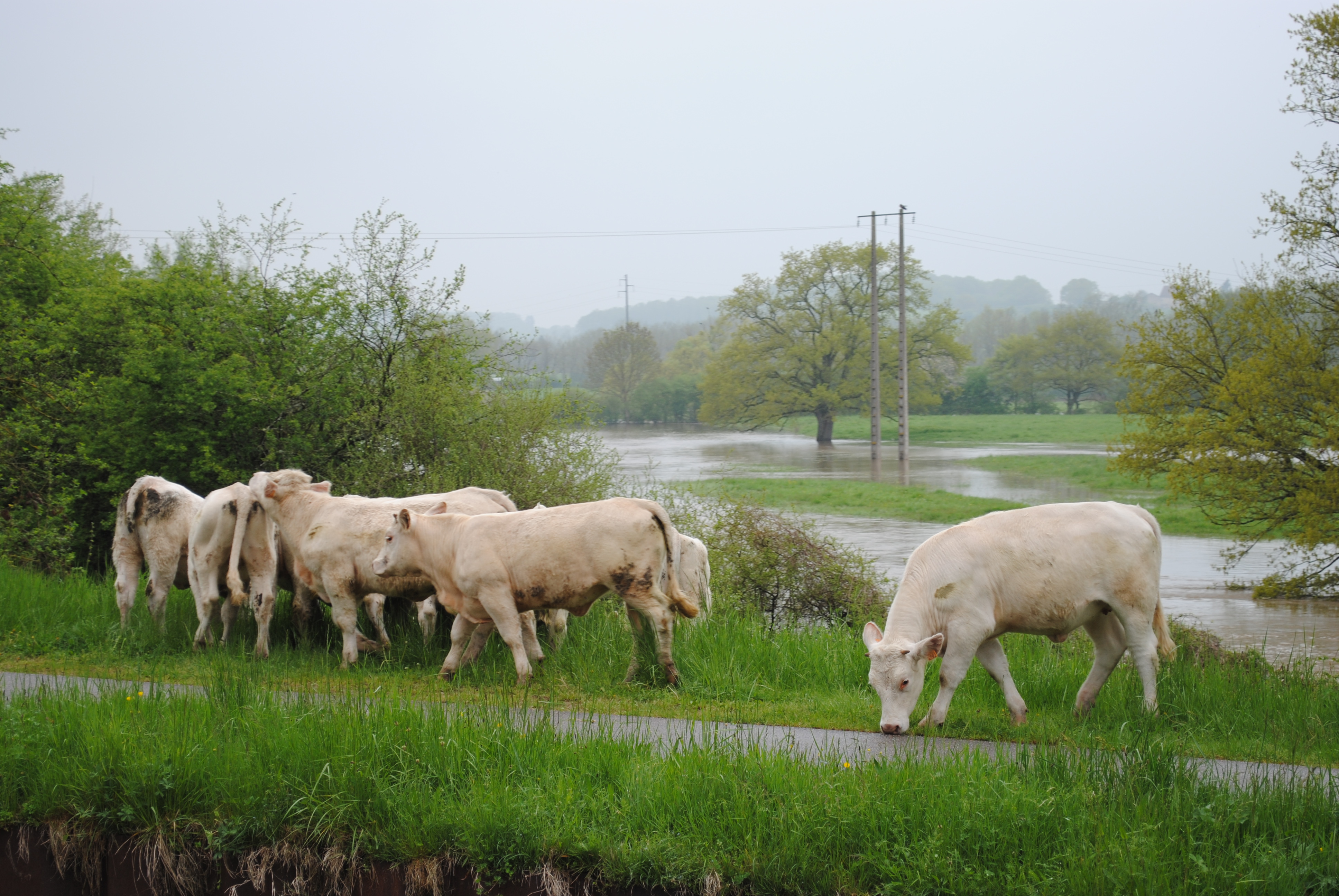 There was a flood in Paray during our vacation. i saw a cow walking down the bike trail after the flood. She looked a bit lost, but she found all the other girls and they had a grand time together.
