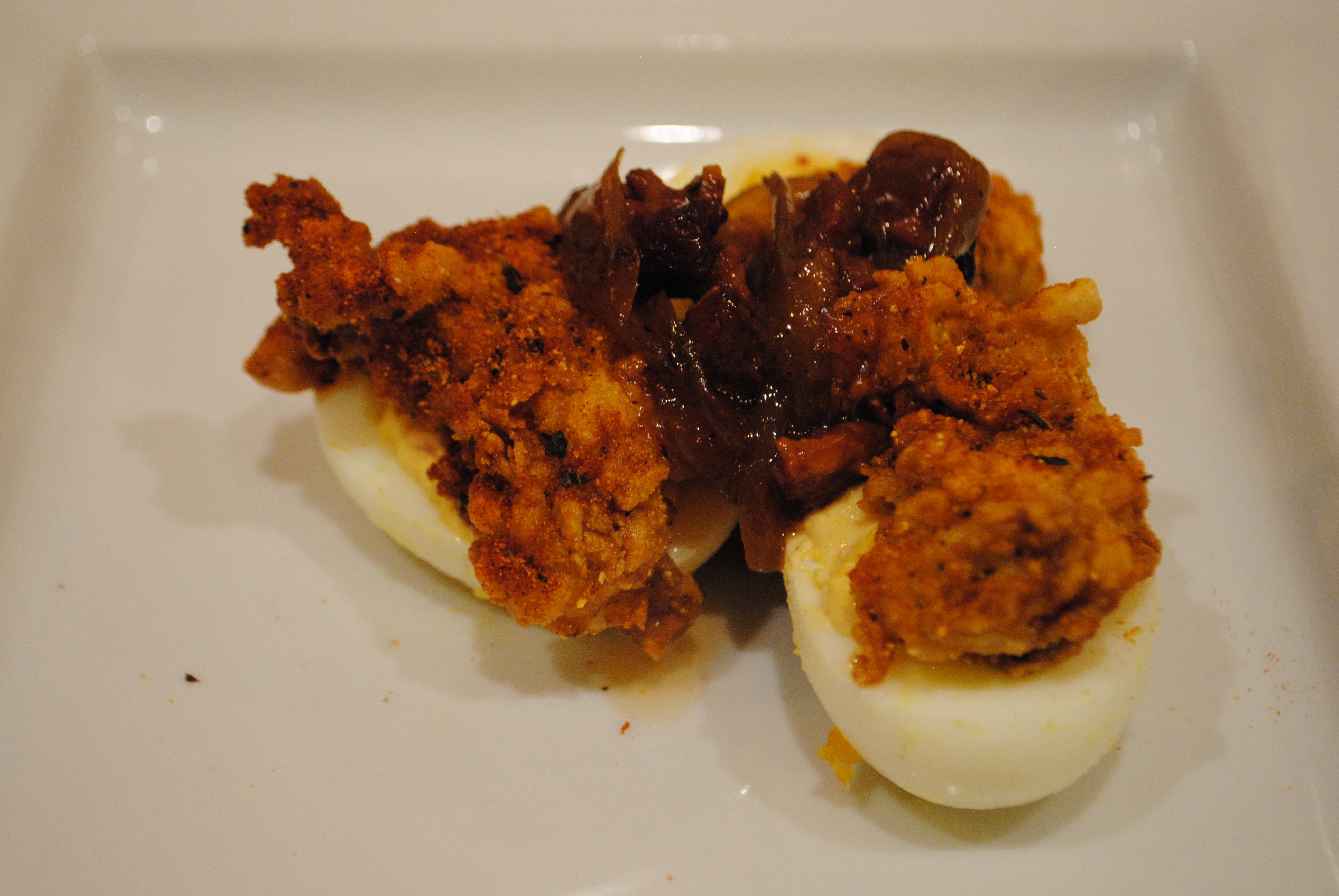 Deviled Eggs with Fried Oyster and Pork Belly